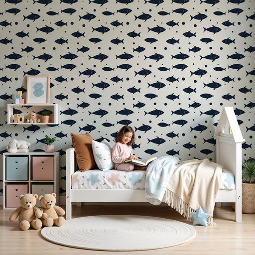 Lastenhuoneen tapetti kuvioilla | Meriaiheinen kuvio stilisoitujen kalojen kanssa