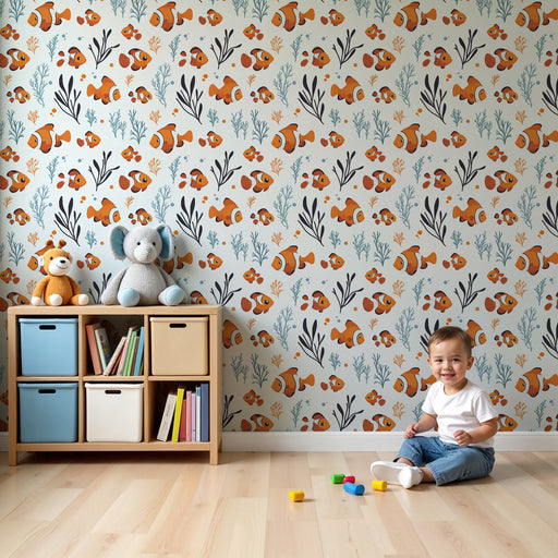 KidsWallUudista lapsesi huonetta todelliseksi merimaailmaksi tällä lastenhuoneen tapetilla, jossa on viehättäviä pieniä oransseja kaloja, jotka uivat tyyli...