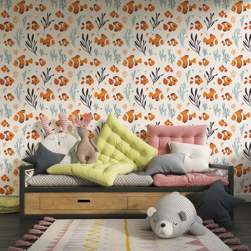 Lastenhuoneen tapetti kuvioilla | Värikkäät klovnikalat merenalaisessa maailmassa