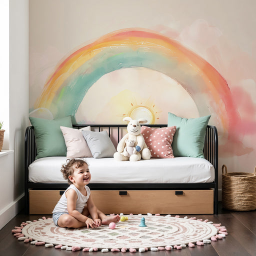 Kuvittele pehmeä ja lohdullinen maailma, jossa satumaailman sateenkaari kulkee pehmeiden pilvien täyttämän taivaan halki. Tämä lastenhuoneen tapett...