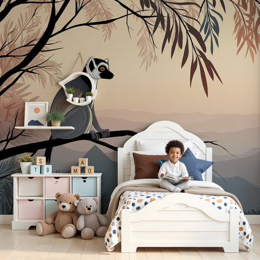 Näytä kaikki tiedotLastenhuoneen tapetti | Lemuristi oksalla auringonnousun aikaan
