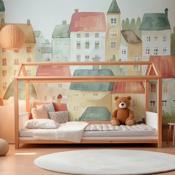 Lastenhuoneen tapetti | Pastellinvärinen kylä värikkäillä katoilla ja akvarellin viehätys