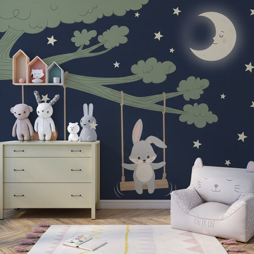 KidsWallDizajnirajte dječju sobu s ovim tapetama za bebe koje prikazuju šarmantni duo životinja: lisicu i zeca, kako se mirno ljuljaju pod zvjezdanim nebom...