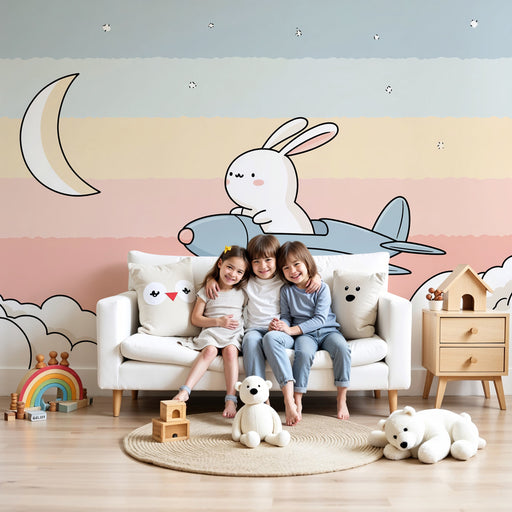 KidsWallUkrcajte se na čarobno putovanje s ovim tapetama za bebe, gdje slatki zec postaje pilot malog aviona iznad mekanih oblaka. S mirnom i sanjivom atmo...