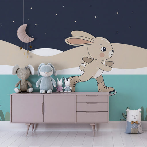 Prikaži sve detaljePapier de parede dječje sobe | Zec klizač na zvjezdanoj ledenoj površini