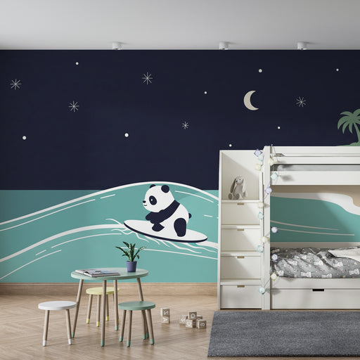 Prikaži sve detaljePapier de parede za dječju sobu | Panda surfer pod mjesecom i zvijezdama