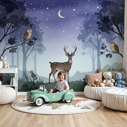 KidsWallTransformirajte dječju sobu u pravu bajku s ovim papirnatim tapetama za djecu koje prikazuju očaravajuću scenu noćne šume. Veliki jelen ponosno sto...