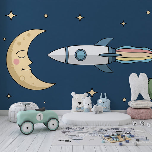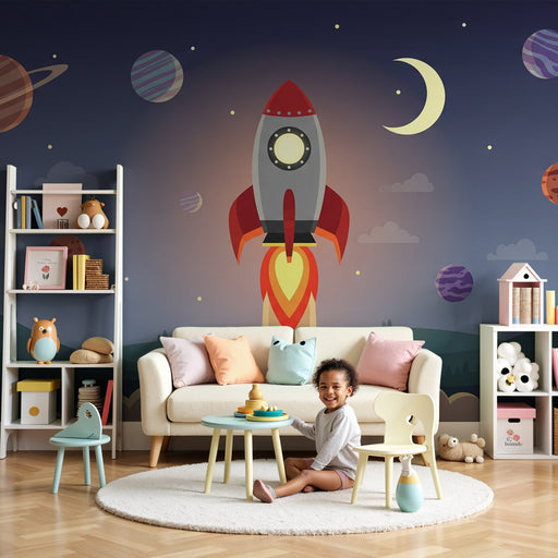 KidsWallUkrcajte se na nevjerojatnu svemirsku avanturu s ovim tapetom za djecu koji prikazuje sjajnu raketu koja leti kroz zvijezde, u pratnji osmijeha mje...