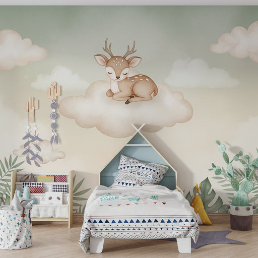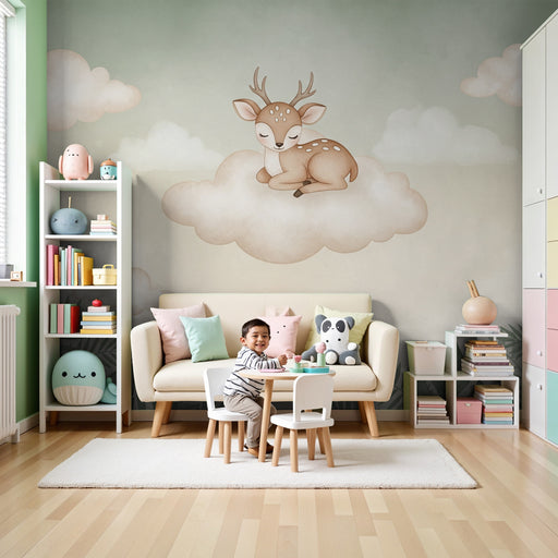KidsWallDonesite dodir nježnosti i mira u dječju sobu s ovim tapetama za djecu koje prikazuju ljupkog mladunca jelena kako spava na mekanom oblaku. Ovaj oč...