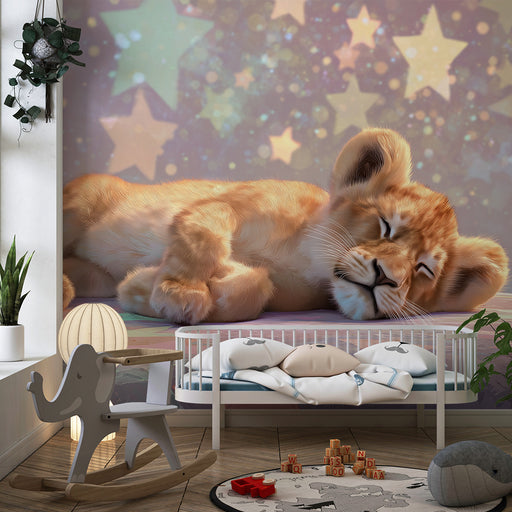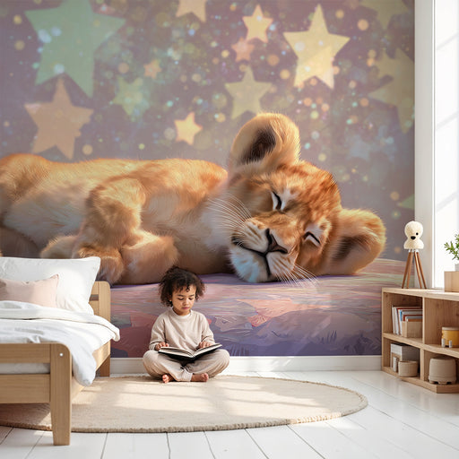 KidsWallDonesite dodir nježnosti i čarolije u sobu svog malog s lavljem tapetom za bebe koji prikazuje preslatkog mladunca lava mirno spavajući. Zvjezdani ...