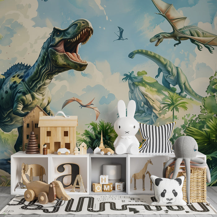 Tapeta dječje sobe | Svijet dinosaura s T-Rexom i pterodaktilima