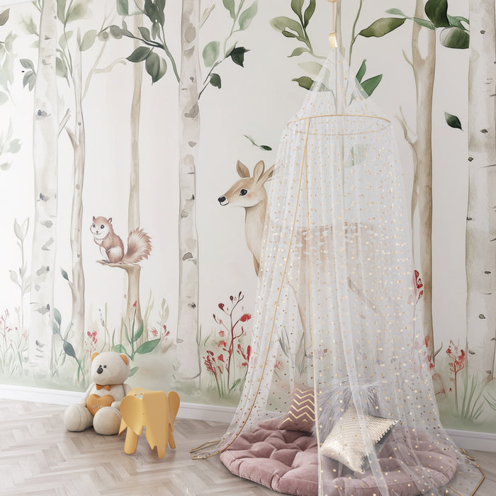 Ponudite svom djetetu očaravajuće putovanje u srce šume s ovim tapetama za dječju sobu. Zamislite svijet gdje graciozni jeleni, nestašne vjeverice i znatiželjne sove koegzistiraju među elegantnim brezama i crvenim gljivama, stvarajući nježnu i bajkovitu atmosferu pogodnu za snove i buđenje.