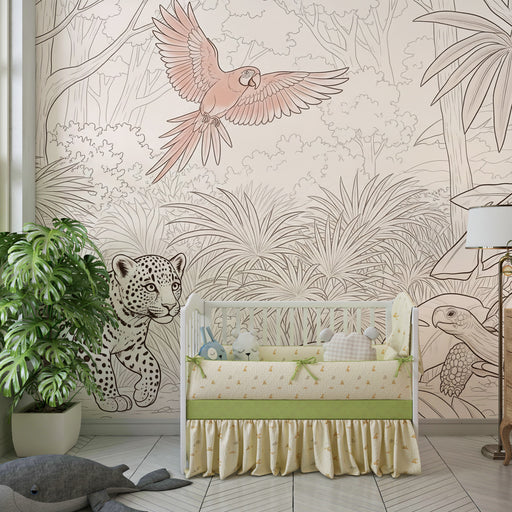 Dječja soba tapeta | Pustolovina u džungli s leopardom, papagajem i kornjačom
