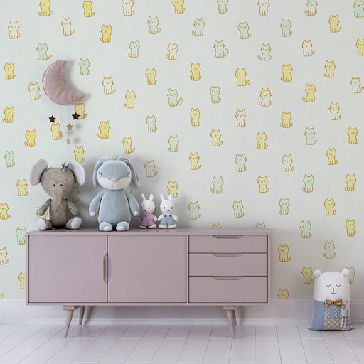 KidsWallDonesite radost i boju u svoj dom s našim šarenim tapetama s mačkama. Savršeno za dječju sobu ili igraonicu, ovaj dizajn prikazuje stilizirane mačk...