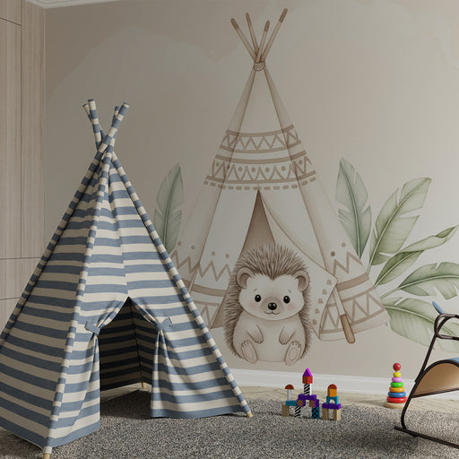 KidsWallStvorite ugodan kokon za svoju bebu s ovim tapetama za dječju sobu koje prikazuju ljubaznog ježa ispred tipija. Ovaj očaravajući dekor, nadahnut pr...