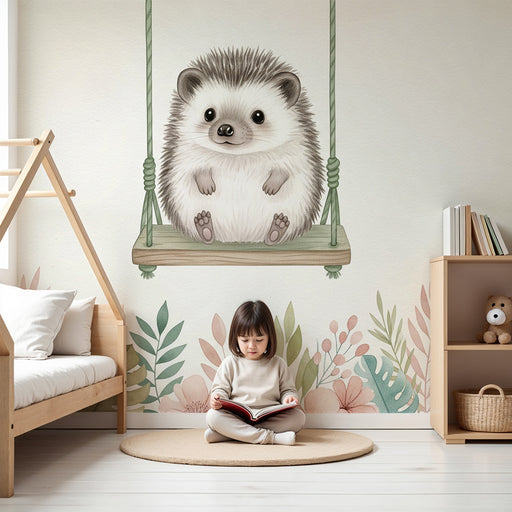 KidsWallStvorite miran i očaravajući prostor u dječjoj sobi svog djeteta s ovim papirom za zid za bebe koji prikazuje slatkog ježa na ljuljački. Okružen nj...