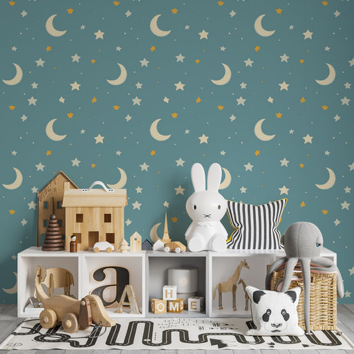 Prikaži sve detaljePapier de parede dječje sobe s uzorcima | Zlatni mjesec i zvijezde na tirkiznoj pozadini