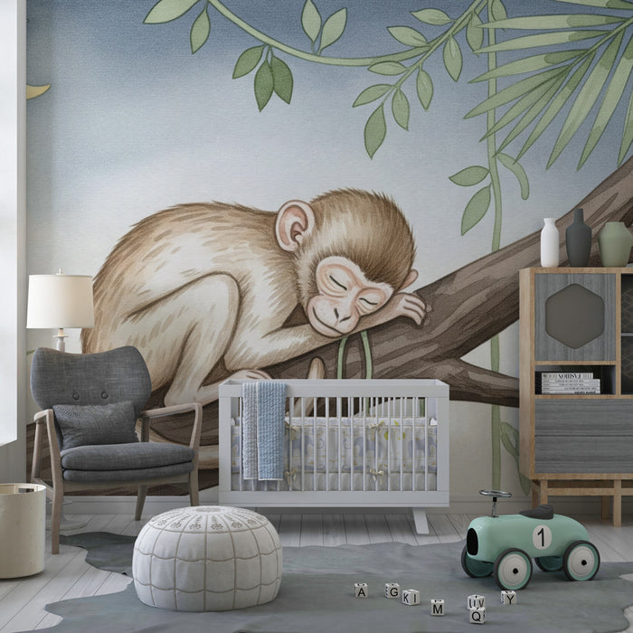 Otkrijte miran i očaravajući svijet s ovim tapetama za djecu koje prikazuju simpatičnog usnulog majmuna na grani. Okružen bujnim lišćem i nježnom mjesečevom svjetlošću, ovaj ukrasni dodatak unijet će dodir spokoja u sobu vašeg malog.