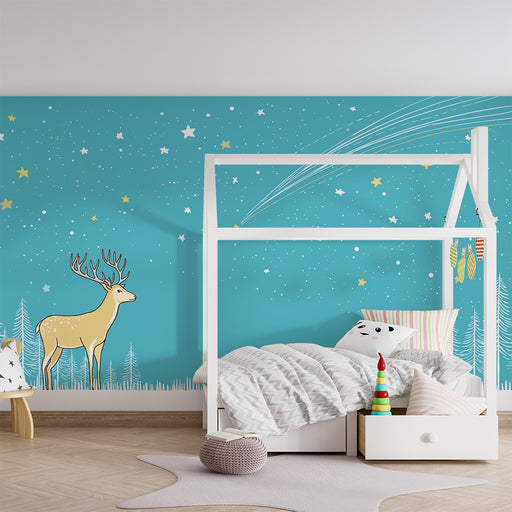 Nursery room wallpaper | Szarvas a csillagos ég alatt fehér fenyőkkel