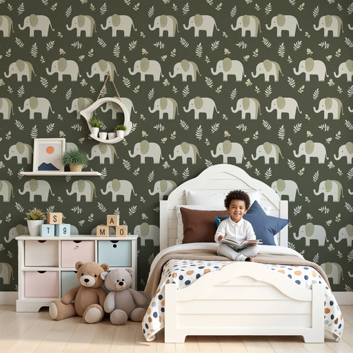 Gyermekszoba tapéta mintákkal | Aranyos elefántok olíva zöld háttéren