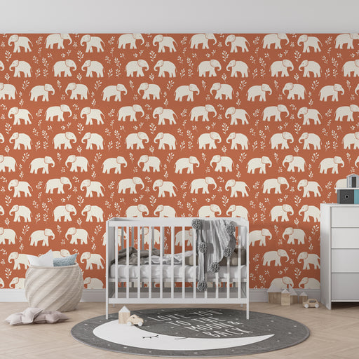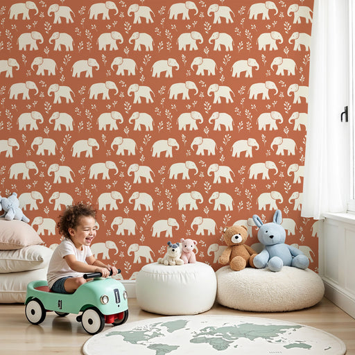 Gyermekszoba tapéta mintákkal | Játékos elefántok terrakotta háttéren
