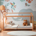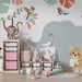 A trópusi levelek és a játékos minták lágy tónusokban festettek, nyugtató de képzeletet serkentő dekorációt nyújtva. Az állatfigurák vidám kifejezései életet lehelnek a szobába, ösztönözve a gyerekeket saját történetek és kalandok megalkotására.