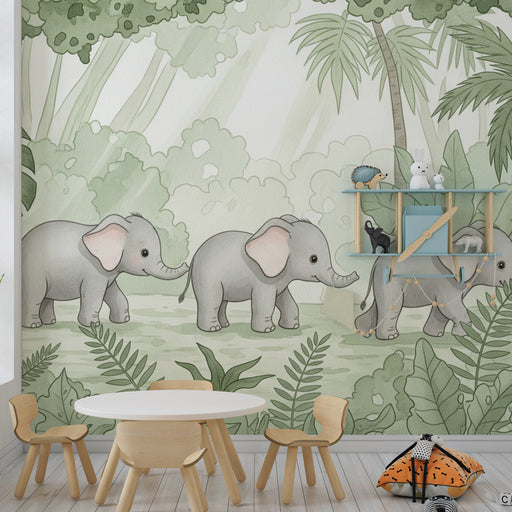 Mergeljen el egy gyengéd világba, ahol a bájos bébi elefántok könnyedén emelkednek a pamacsos felhők között, finom arany lufikkal repülve. Ez a gyermekszoba tapéta varázslatos és nyugtató légkört teremt, tökéletesen öleli körül kis kincsét a gyengédség és álmodozás kényelmes fészkében.