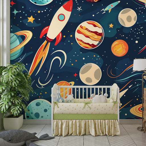 Gyerekszoba tapéta | Űrkaland rakétákkal és színes bolygókkal