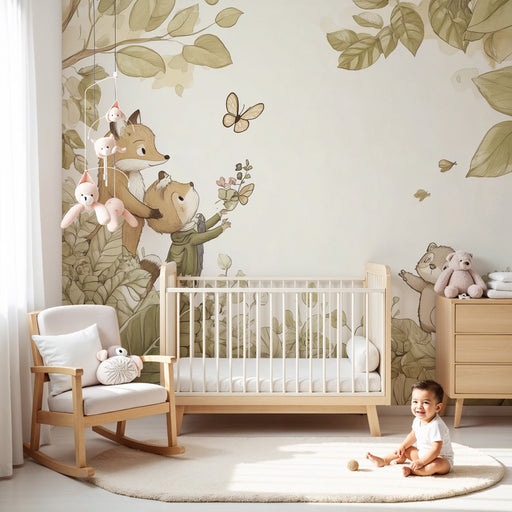 Gyermekszoba tapéta | Varázslatos erdő rókákkal és repülő pillangóval
