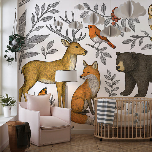 KidsWallAlakítsa át gyermekszobáját egy békés menedékké ezzel a gyermek tapétával, amely bájos erdő állatokat ábrázol. Egy szürke nyúl, egy szarvas, egy ró...