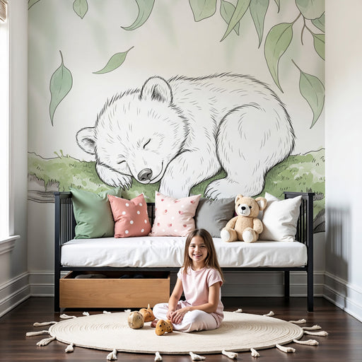 KidsWallHozzon létre egy puha és nyugtató világot gyermekének szobájában ezzel a gyermek tapétával, amely egy álmos csecsemőmedvét ábrázol egy mohával borí...