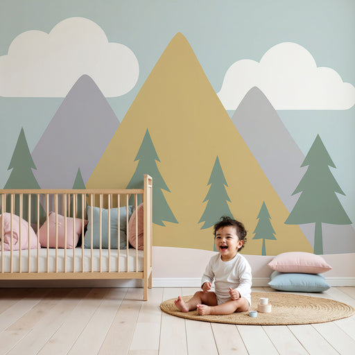 KidsWallLégy elragadtatva egy nyugtató tájképbe, ahol a lágy árnyalatú hegyek emelkednek az égre egy fényben fürdő égbolt alatt. Ez a gyerekszoba tapéta ny...