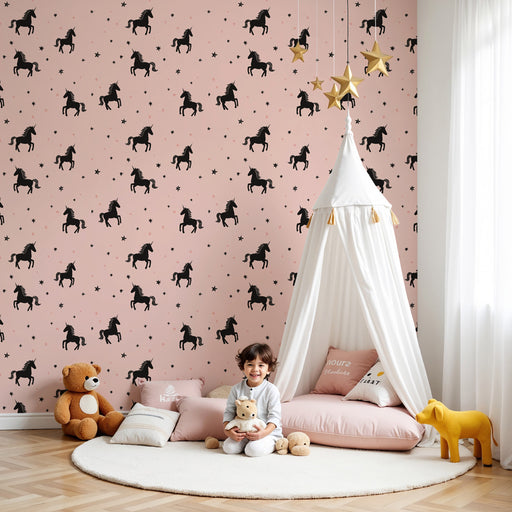 Gyermekszoba tapéta mintákkal | Fekete unikornisok rózsaszín háttéren
