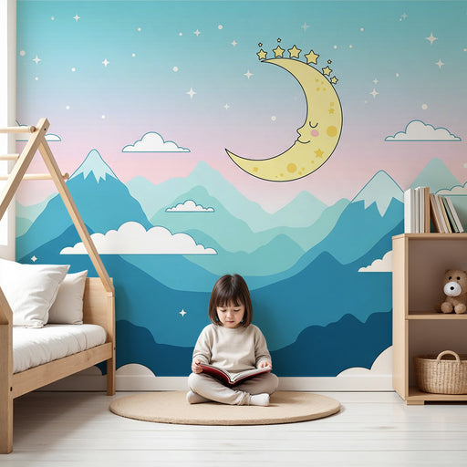 KidsWallAlakítsa át a babaszobát egy túl aranyos helyré ezzel a baba tapéta amely finom hegyeket ábrázol csillagos ég alatt. A mosolygó hold vigyáz a tájra...