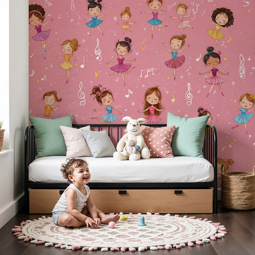 KidsWallAdjon egy csipet boldogságot és puhaságot gyermeked szobájához a mi táncoló tapétánkkal, mely vidám balettezőket ábrázol egy finom rózsaszín hátter...