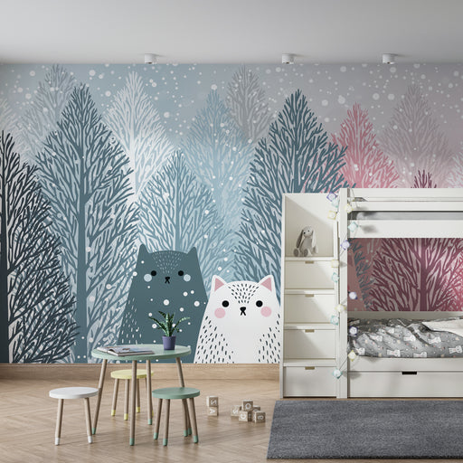 KidsWallAlakítsa át gyermekszobáját egy puha téli menedékké ezzel a gyerekszoba tapéta segítségével, amely aranyos macskákat ábrázol egy hó borította erdőb...