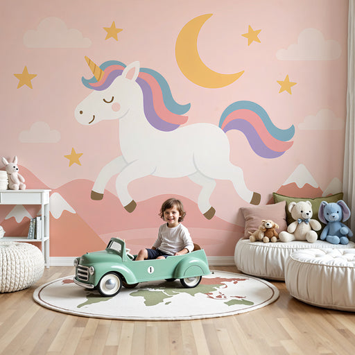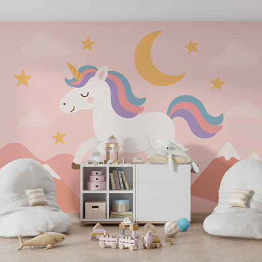 KidsWallIndulj egy varázslatos kalandba ezzel a gyerekszoba tapétával, melyben egy aranyos, repülő unikornis látható, csillagos ég alatt. Ez a pasztell szí...