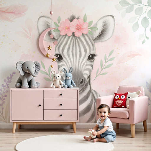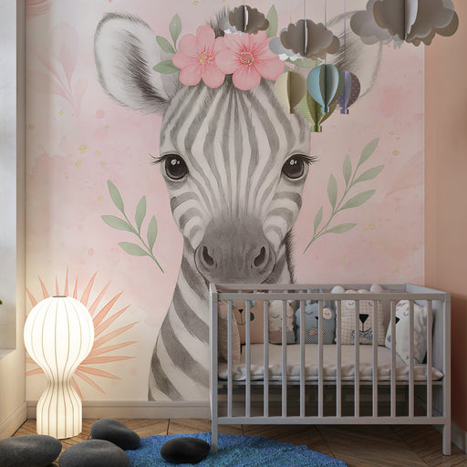KidsWallAdj hozzá egy kis puhaságot és bájt gyermekszobájához ezzel a gyerekszoba tapétával, amely egy aranyos zebrát mutat be egy virágkoronával díszítve....