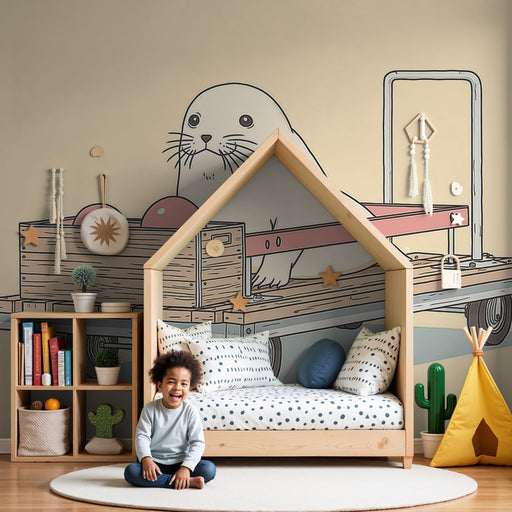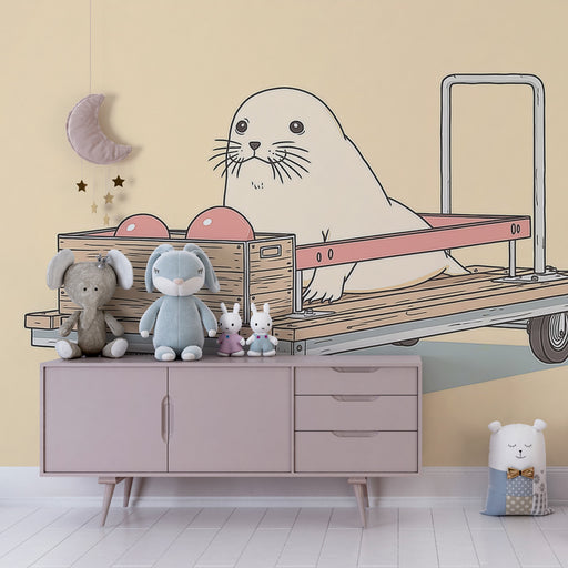 KidsWallAdj hozzá egy kis vidámságot és humor a gyermekszobához ezzel a gyerekszoba tapétával, amely egy aranyos fókát ábrázol egy kocsin. Ez a játékos des...