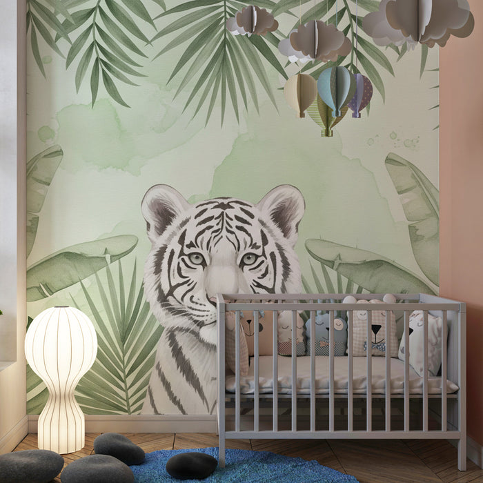 Alakítsa át gyermekszobáját egy valódi természet szentélyévé ezzel a gyerekszoba tapétával, amelyen egy fehér tigris uralkodik egy buja növényzet közepén. A lágy zöld színű trópusi levelek körbeveszik ezt az ikonikus ragadozót, létrehozva egy exotikus és nyugtató hangulatot.