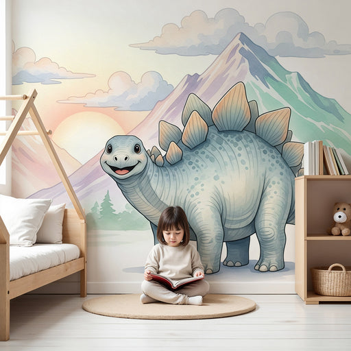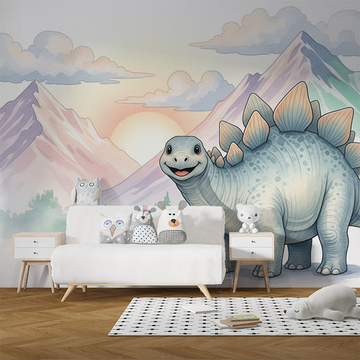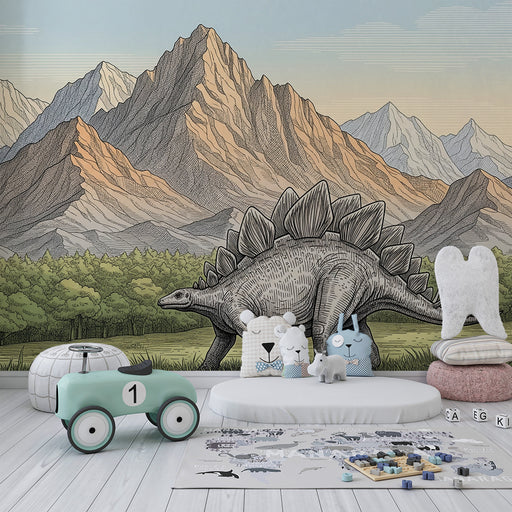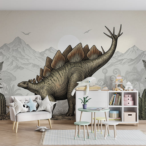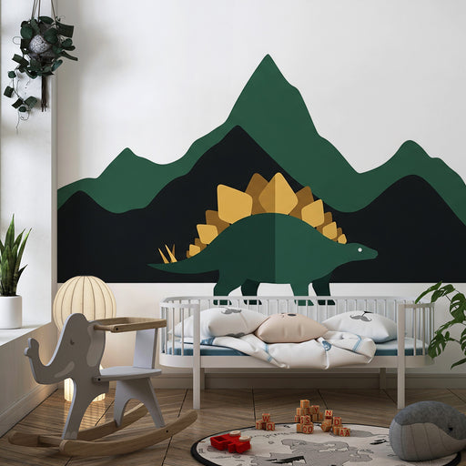 Afficher tous les détailsGyermekszoba tapéta | Stilizált stegoszaurusz és hegyek