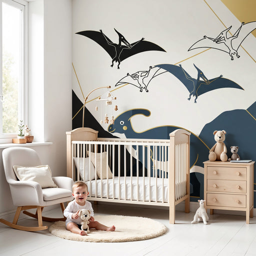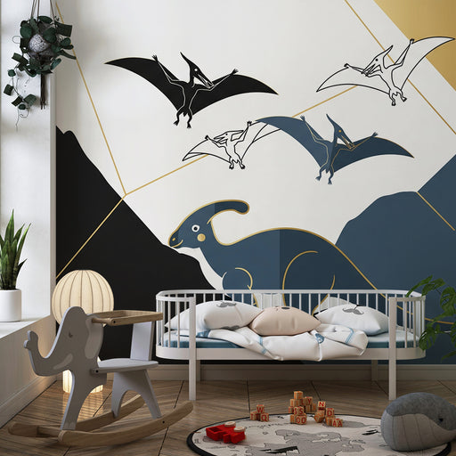 KidsWallAlakítsa át gyermekszobáját egy lenyűgöző ősvilággá ezzel a gyermek tapétával, amely dinoszauruszt és stilizált pteroszauruszt ábrázol. A geometria...