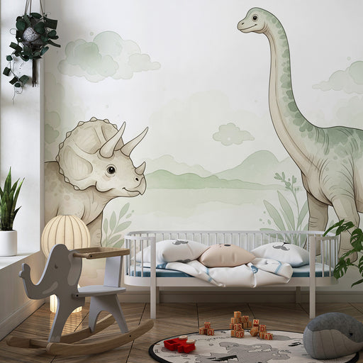 Afficher tous les détailsGyermekszoba tapéta | Aranyos dinoszauruszok Triceratops és Brachiosaurus egy lágy tájképben