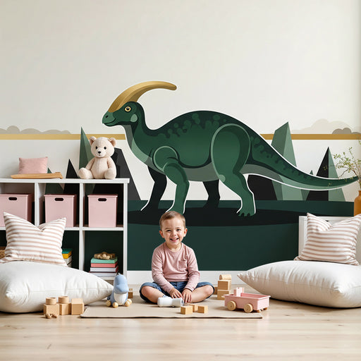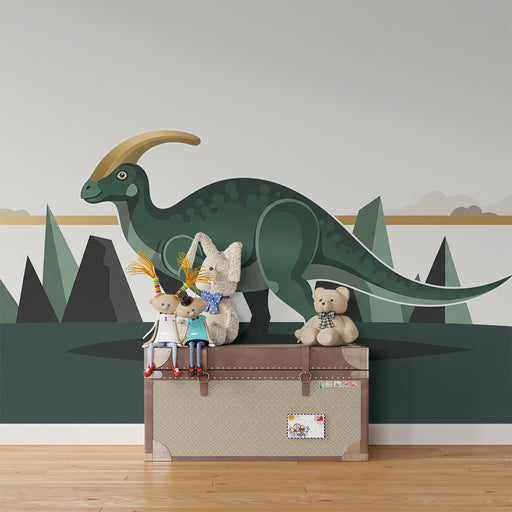 Afficher tous les détailsGyermekszoba tapéta | Zöld dinoszaurusz és stilizált őskori táj
