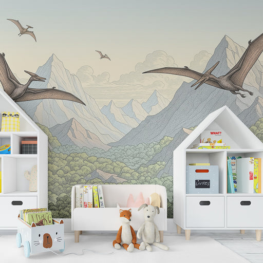 Afficher tous les détailsGyermekszoba tapéta | Tiranoszaurusz és pteroszauruszok hegyek hátterében