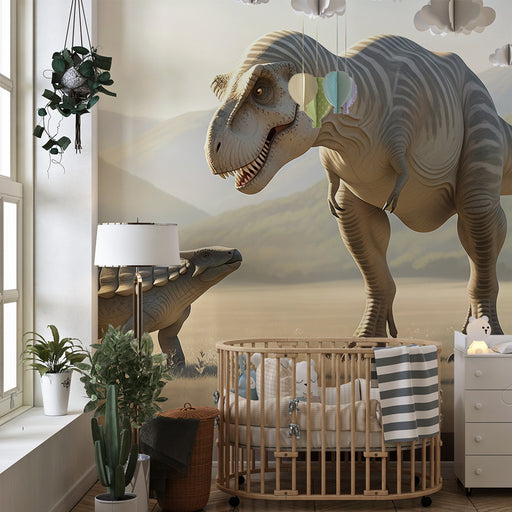 KidsWallMélyeszd el gyermekedet egy lenyűgöző ősi világban ezzel a gyerekszoba tapétával, amelyen egy fenséges t-rex látható, amint egy hegyvidéki tájat ur...