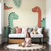 Alakítsa át gyermekszobáját egy mókás őskori világgá ezzel a gyermek tapétával, melyen mosolygó dinoszauruszok láthatók. Ezek a színes teremtmények, trópusi levelekkel körülvéve, játékos és vidám hangulatot teremtenek a térben. A lágy zöld és narancssárga árnyalatok meleg és barátságos légkört teremtenek.