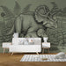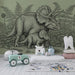 Mergeljen el a dinoszauruszok lenyűgöző világába ezzel a gyerekszoba tapétával, amely egy méltóságteljes triceratops-ot és aranyos kicsinyét ábrázolja. Ezek a őskori lények buja növényzet között kalandot és kíváncsiságot hoznak a gyermekszobába.