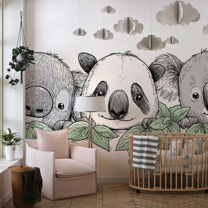 Adj hozzá egy játékos és puha érintést a gyermekszobához ezzel a gyerekszoba tapétával, amely mosolygó koalákat és egy pandát ábrázol zöldellő levelek között. Ezek a bájos állatok nagy, csillogó szemükkel készen állnak arra, hogy mosolyt csaljanak a kisgyermek arcára, és vidám hangulatot teremtsenek a térben.