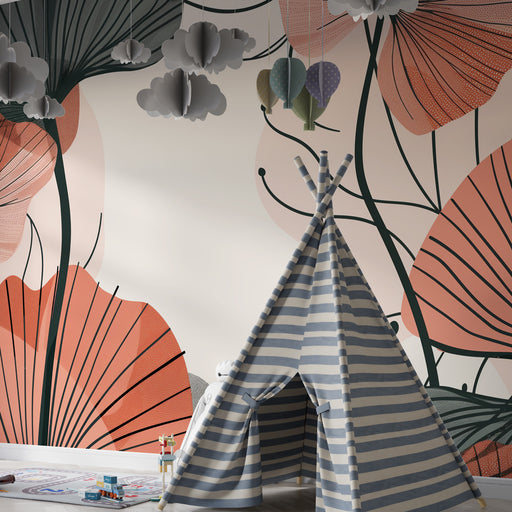 KidsWallHozzon be egy kis puhaságot és természetet gyermekszobájába ezzel a gyermek tapétával, melyet finom virágok díszítenek meleg terrakotta hátterű ala...